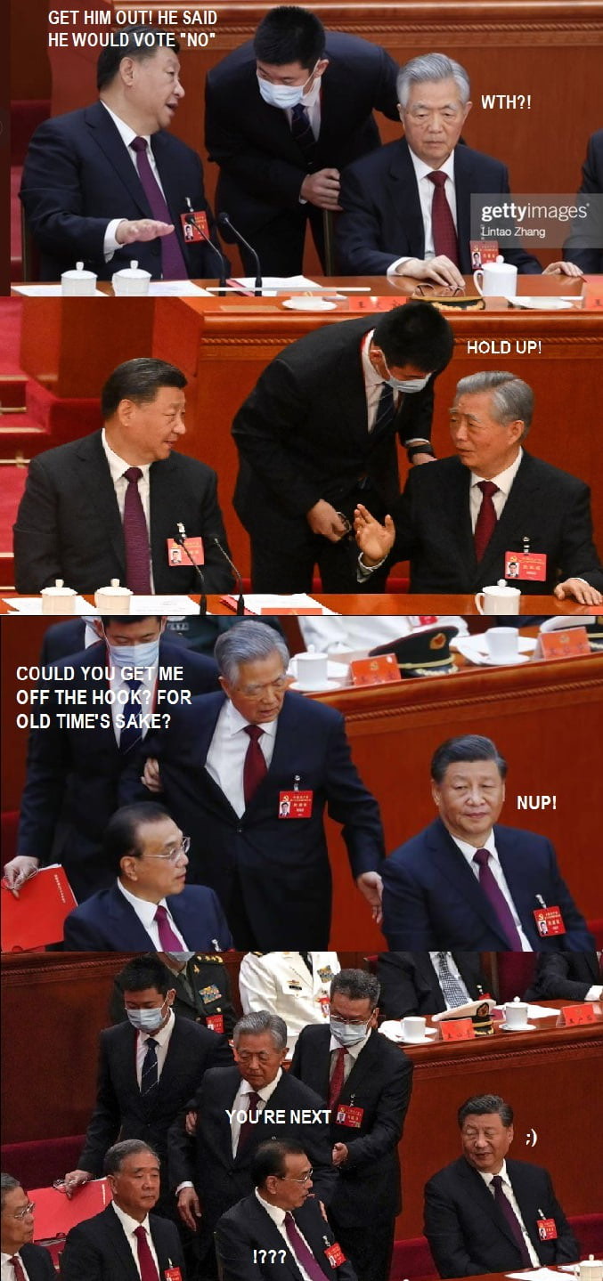 Aparentemente pode passar despercebido, mas tiram assim um ex presidente, sem ninguém se levantar para o proteger ou ajudar, isso diz muito sobre os próximos tempos na China.. uma mudança e ruptura com o passado é uma nova China mais autoritária e mais próxima das políticas do putin.