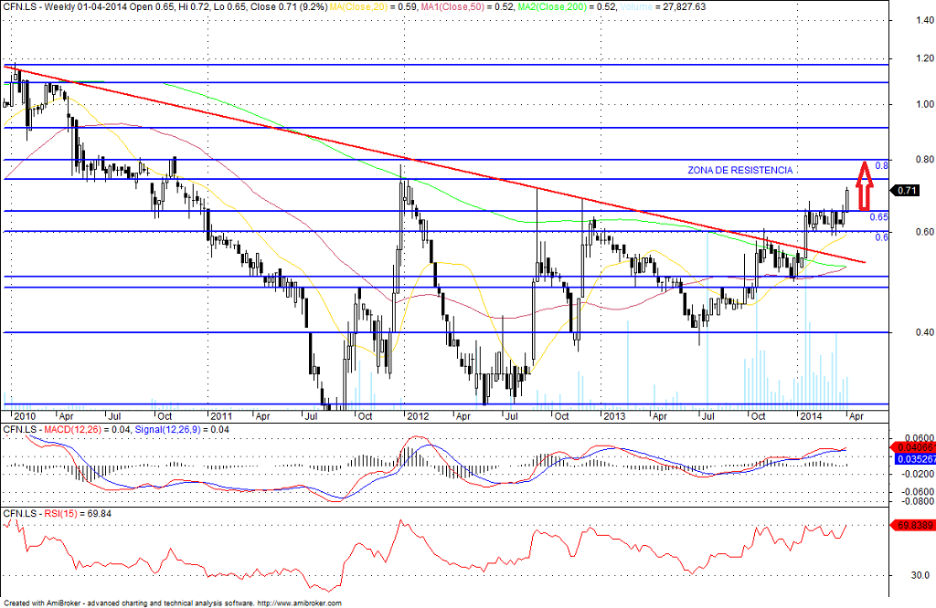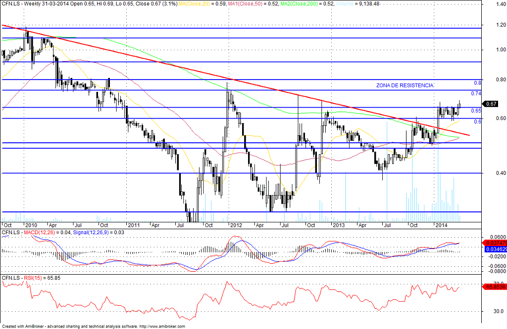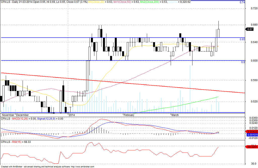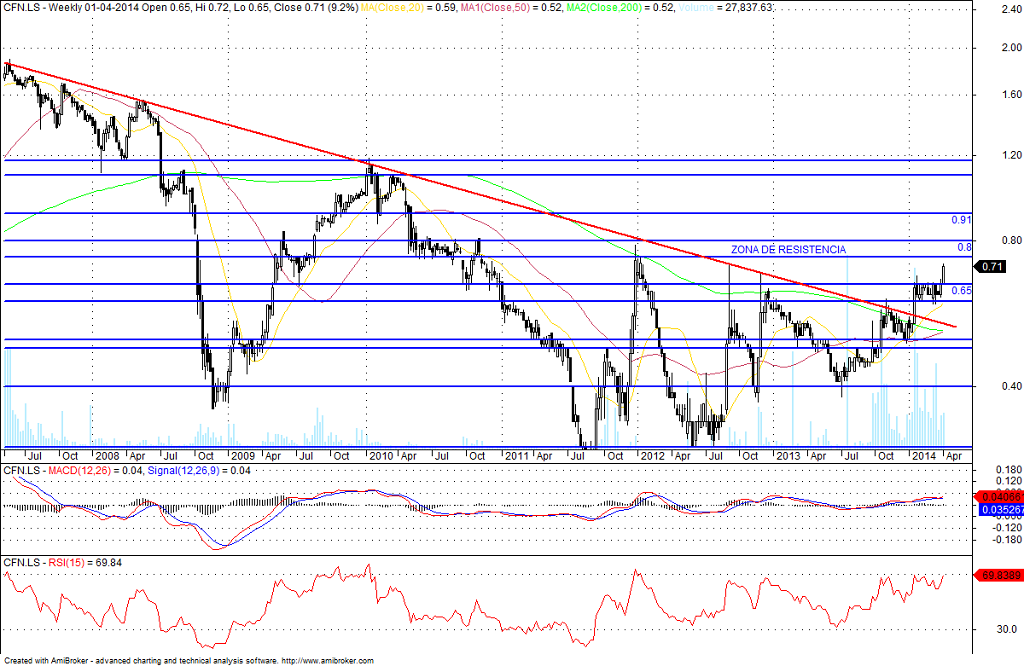 Hoje mostrou grande força no fecho sendo que entre 400 a 500 mil acções foram negociados nos ultimos 15 minutos a 70 centimos. Amanhã logo se verá se continua para Norte. Tudo indica que sim. Rompimento de resistência com forte volume.