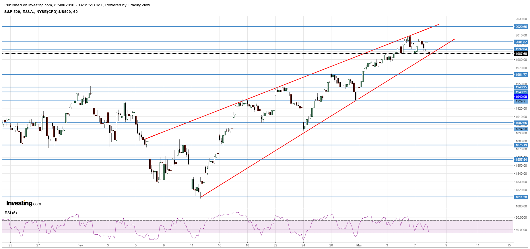 O NASDAQ parece ter quebrado um suporte de curto prazo e a cunha, o petróleo parece estar numa resistência e o DAX também está a espatifar-se. Estando o S&P numa resistência também, o caminho mais provável para mim é para baixo, mas o gajo às vezes passa-se..