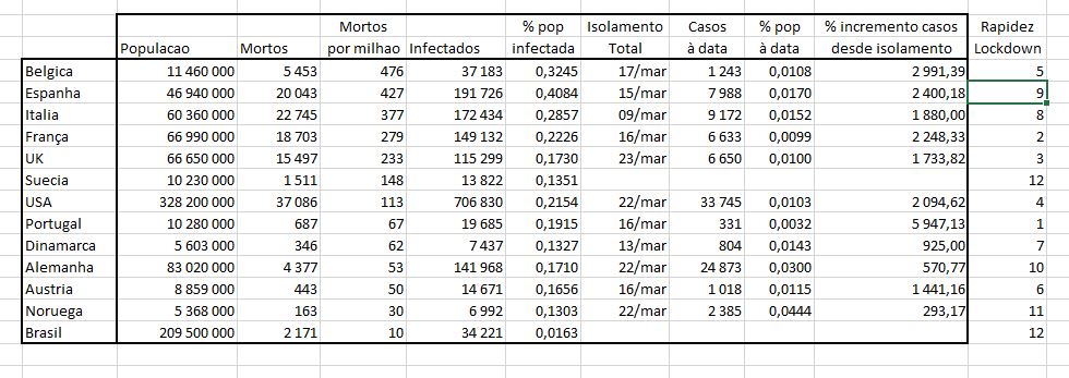 Tens, por exemplo, a Franca que desta tabela foi o 2º pais mais rapido a tomar medidas de lockdown e mesmo assim é o 4º pior pais em numero de mortos por milhao