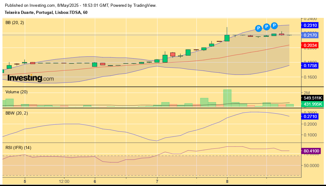 Pmart 1 Escreveu:A aliviar indicadores e a consolidar a Teixeira Duarte vai a caminho dos 0,20€ numa primeira fase a estes niveis ,não aparecem vendedores fortes o que dado o histórico é uma boa nova.