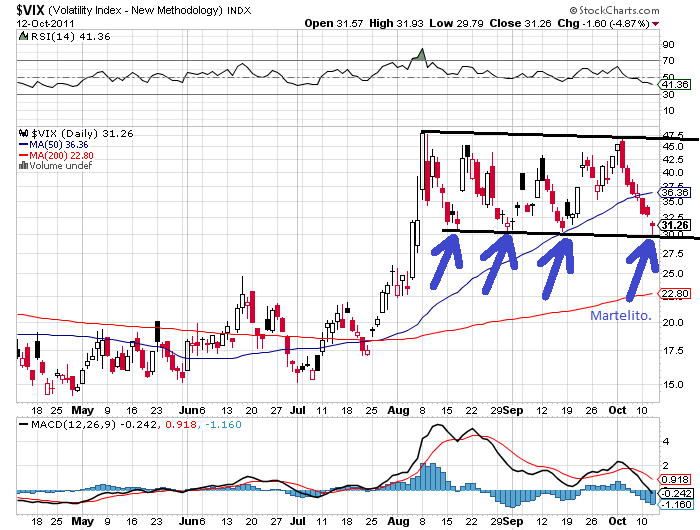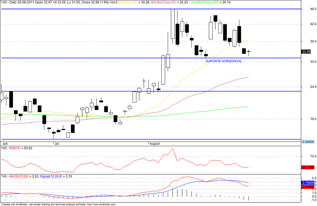 Tendo em conta a forte possibilidade de hoje se confirmar a quebra em alta da zona de resistencia do sp, o que poderá levar à quebra da zona de suporte do vix nos 31/30, a próxima zona de suporte que se segue está nos 23/24.