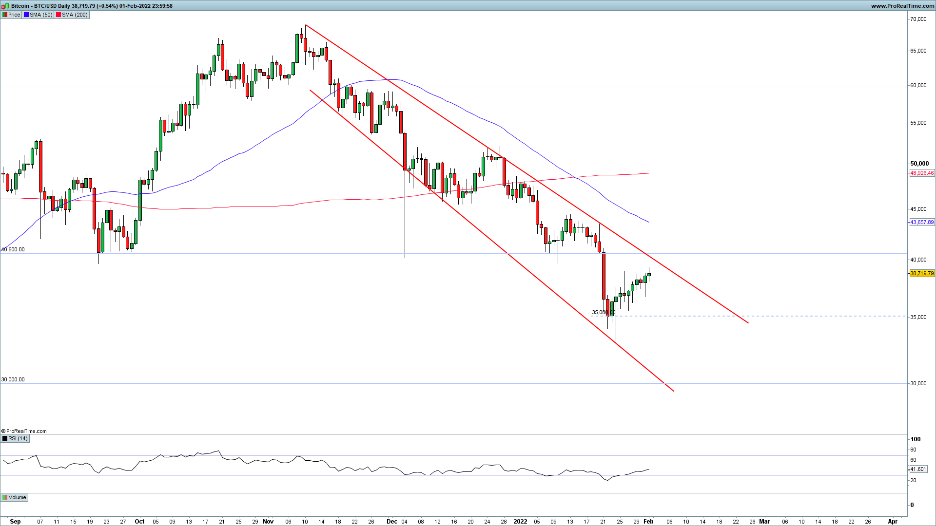 Aqui é bastante simples - num canal descendente, quebrou os 40k e parece querer ir lá testar. Se romper a resistência horizontal e diagonal (canal) pelos 40k é um sinal fortíssimo, se rejeitar, vai ao fundo do canal e suporte 30k!