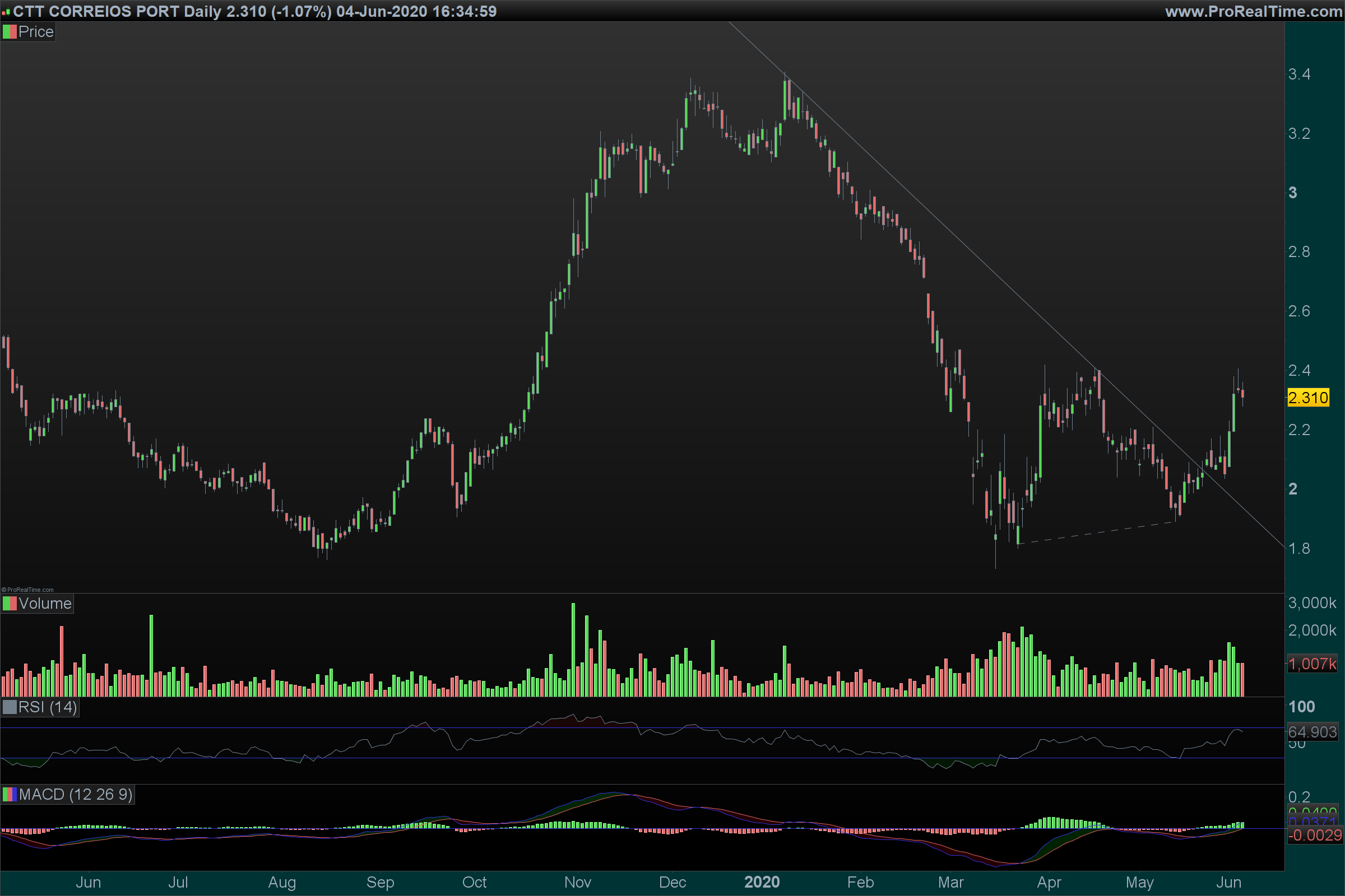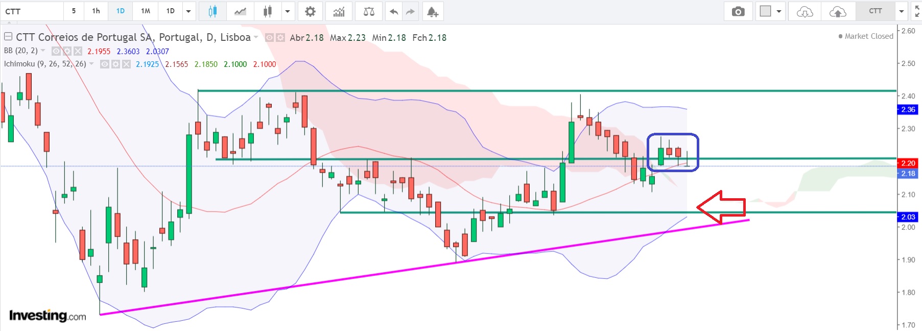 Nas últimas 4 sesões, por 3 vezes fez o mínimo em 2.18! Na 6ª feira, fechou abaixo da média da Banda de Bollinger! Se amanhã, dia 22/06/2020, romper os 2.18, entro curto a 2.17. Se no início da sessão o valor abrir mais abaixo, por exemplo 2.15, entre curto até esse valor. A saída está programada para os 2.05. O stop loss fica nos 2.30, dois cêntimos acima do valor máximo das últimas 4 sessões! Este é um exercício de swing trading!