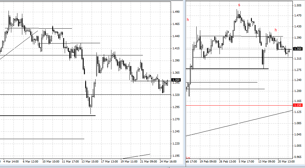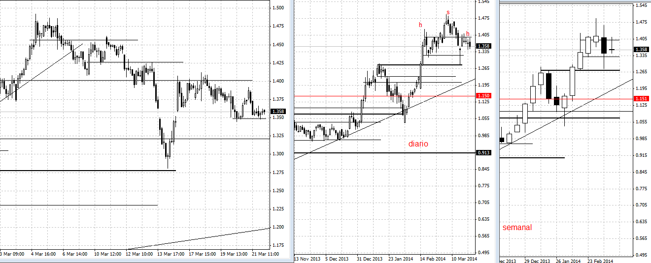 no gráfico semanal aquelas ultimas 3 velas não me coloca nada otimista para o medio prazo,e no gráfico diário vejo ali um H&S que a ser adicionado pode nos levar para os valores de 1,15,no curto prazo caso quebre os 1,34 e ver se reage na zona dos 1,31-1,28,caso quebre os 1,28 possivelmente temos a visita aos 1,15