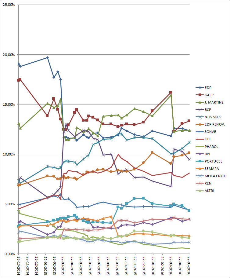 Alguém consegue fazer o gráfico com os pesos das cotadas no índice desde por exemplo 2000? 2005? 2008? 2010?