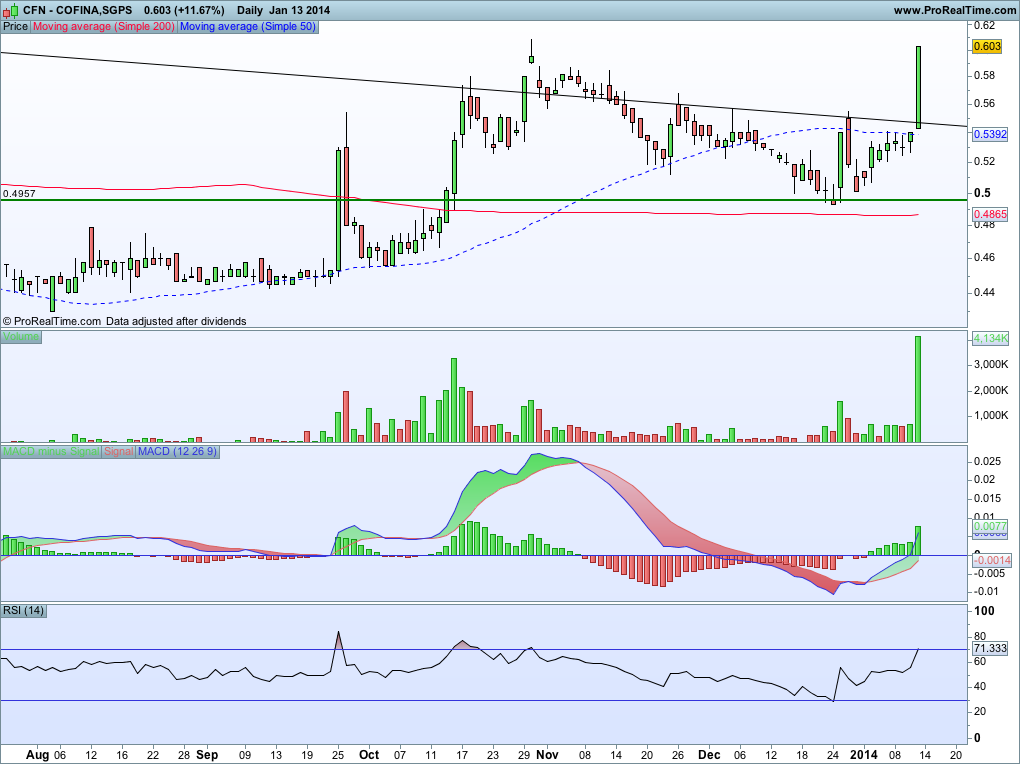 , mas enquanto continuar este volume com velas diárias "catitas" tem condições para subir ainda mais. Se a LTd for realmente quebrada e posteriormente a resistência nos 0,70€ considero que a Cofina entrou em Bull Market, e se assim for o ano de 2014 seria potencialmente bastante positivo.Agora nos mercados, como sabemos, temos sempre que esperar todos os cenários possiveis, reteste à LTd, falso breakout, ir directo à resistência, lateralizar, etc.