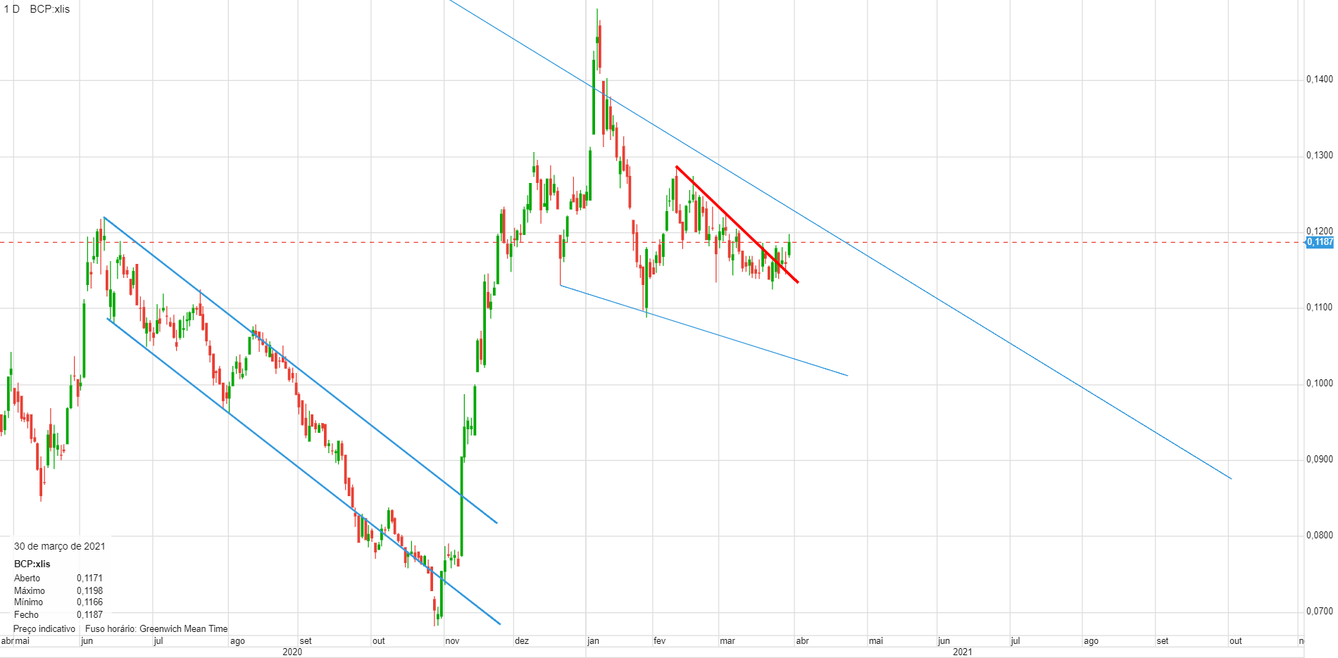 A LT de curto prazo (a vermelho), que vinha limitando o preço do BCP, foi quebrada - ou melhor, foi furada - já que a quebra, não se deu com uma subida que se veja