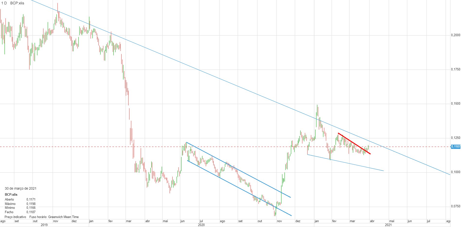 Quanto à actual cotação, o BCP continua a lateralizar num range 0,1140/0,1240 desde pouco antes do início da 2ª quinzena de janeiro. Vamos ver quando e como termina. Mas, pessoalmente, gosto de lateralizações longas porque trazem-me muito boas memórias.
