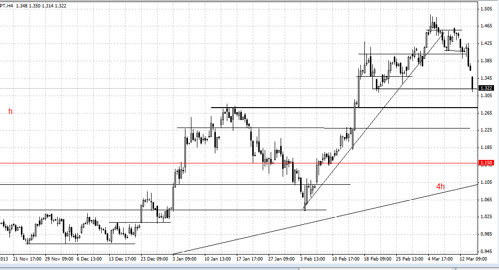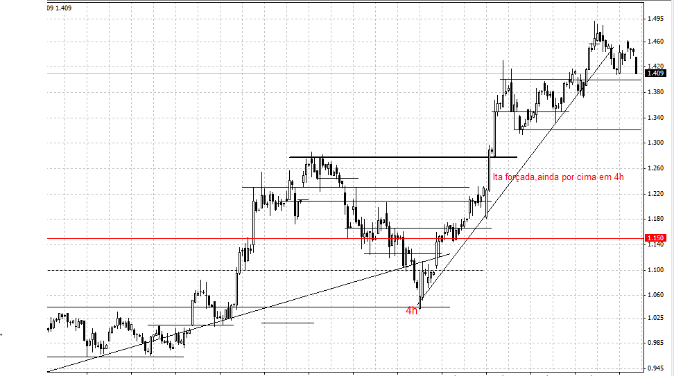 quanto ao time de 4h e de ser um time menor,se querermos descer ainda mais um time e ir ao gráfico de 1h,vemos uma leg up que vem dos 1.04 e que provavelmente chegou ao fim tendo o seu max nos tais 1,495,entrando agora na sua fase descendente,cortando a sua lta alertando -nos para uma possível inversão dessa tendência asc.,mas tendo em conta que se trata de um time menor mesmo com os tais mais de 3 toques,vai-se dar uma olhada aos times uperiores tipo diário e o que se observa é o preço a testar uma zona de suporte com alguma relevância,antiga resistência e ai esperasse para ver o que a acçao vai fazer,se quebrar voltamos a descer aos times dito menores e ai ver algum tipo de reação seja ela em resistência ou suporte.