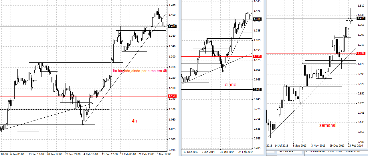 quanto ao time de 4h e de ser um time menor,se querermos descer ainda mais um time e ir ao gráfico de 1h,vemos uma leg up que vem dos 1.04 e que provavelmente chegou ao fim tendo o seu max nos tais 1,495,entrando agora na sua fase descendente,cortando a sua lta alertando -nos para uma possível inversão dessa tendência asc.,mas tendo em conta que se trata de um time menor mesmo com os tais mais de 3 toques,vai-se dar uma olhada aos times uperiores tipo diário e o que se observa é o preço a testar uma zona de suporte com alguma relevância,antiga resistência e ai esperasse para ver o que a acçao vai fazer,se quebrar voltamos a descer aos times dito menores e ai ver algum tipo de reação seja ela em resistência ou suporte.
