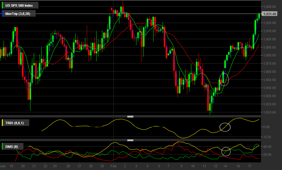 Grafico 4h com sinalizaçao de compra desde os 1860pts,mms ainda compradas,trix e adx,ciclo de compra ainda nao foi interrompido.Penso existir probabilidade muito em breve de termos estancarmos as compras e iniciar vendas,proximidade á zona de resistencia 1950pts,trix com divergencia negativa,adx a indicar possivel duplo topo.