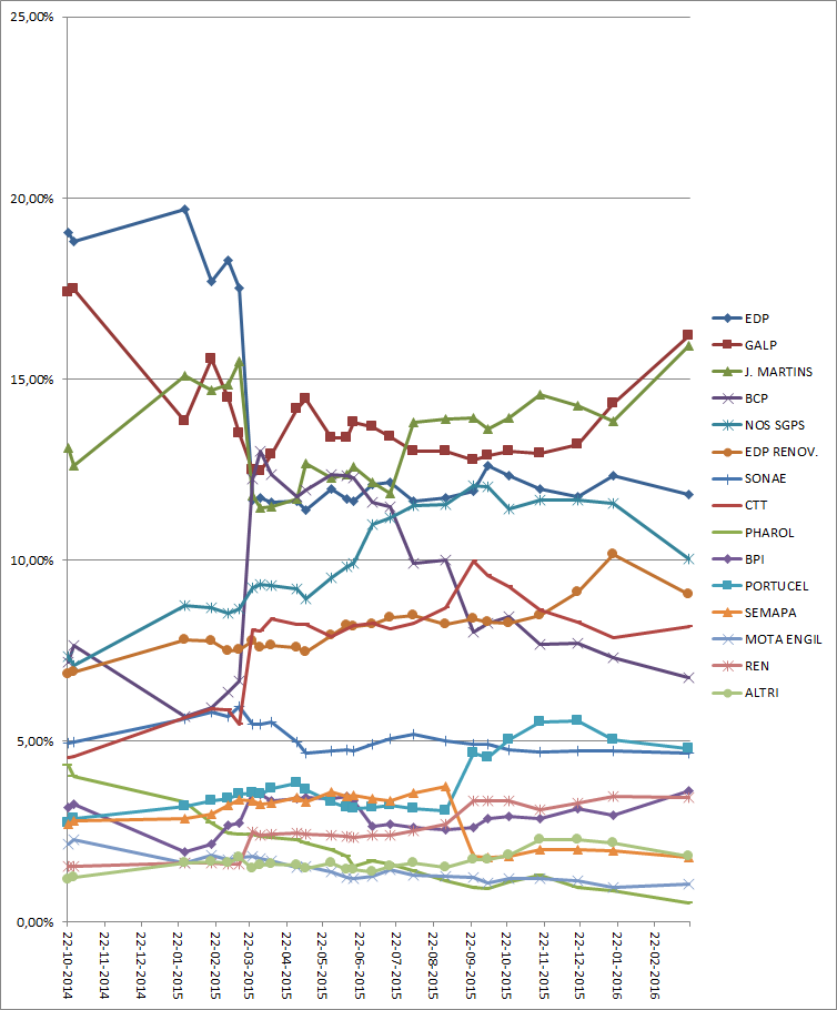 Grosso modo podemos dizer que se GALP e JM continuarem a crescer e EDP, NOS e BCP arrebitarem podemos ter então o muito esperado bull market