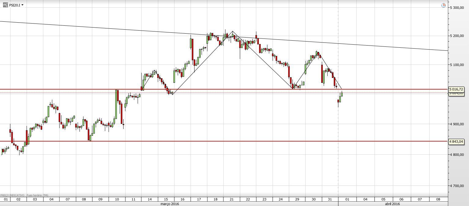 Fecho de vela mensal que se esvaziou um bocado na recta final (tivesse o mês 4 semanas e a cara era outra se calhar). Dúvida continua: vela foi de ressalto ou vai retomar tendência? No diário cruzamento da MACD. No semanal indefinição.