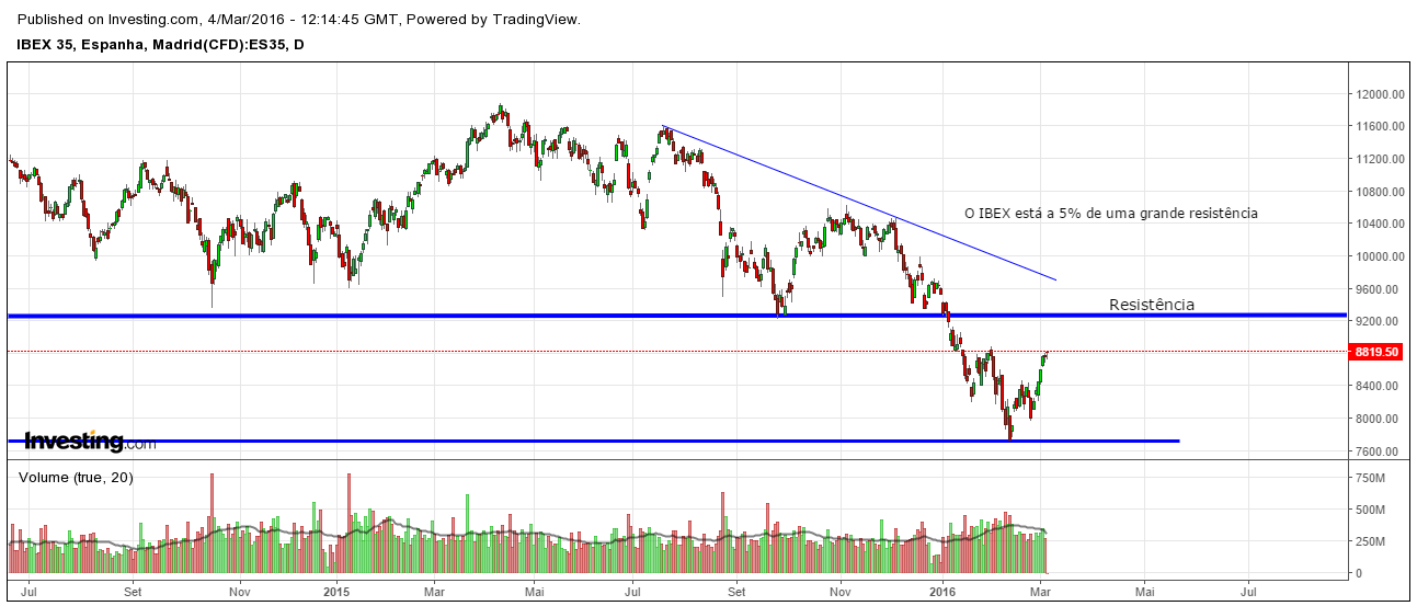 Mais um esforço exegético: o IBEX, que tem oscilado como o PSI, está a 5% de uma grande resistência: 9200 pontos.