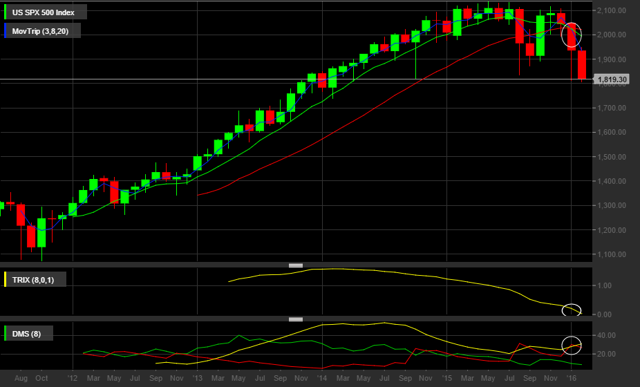 O mensal até medo medo de olhar,quem tiver pachorra de operar neste time frame tem fortes possiblidades de entrar em cheio num bear market,o sinal foi dado pelo cruzamento das mms na vela do mês passado abaixo dos 2000pts,trix perto de romper o eixo 0,adx a acelarar na venda,a vela deste mês obviamente ainda está a ser formada...