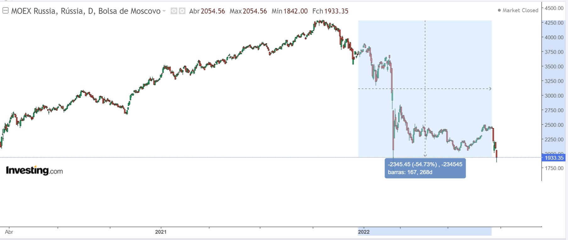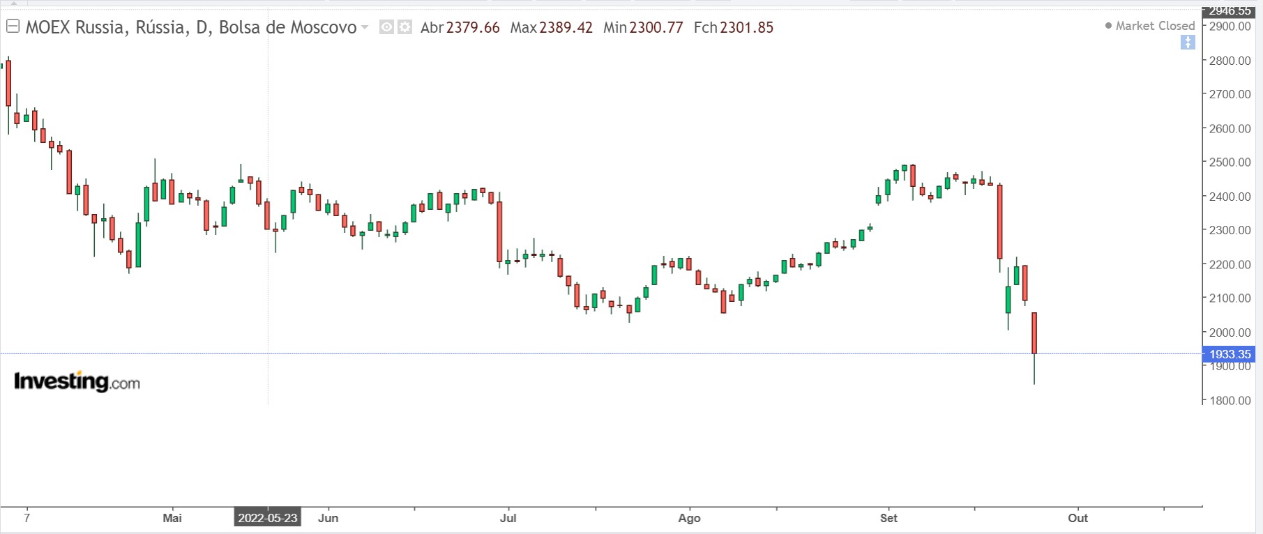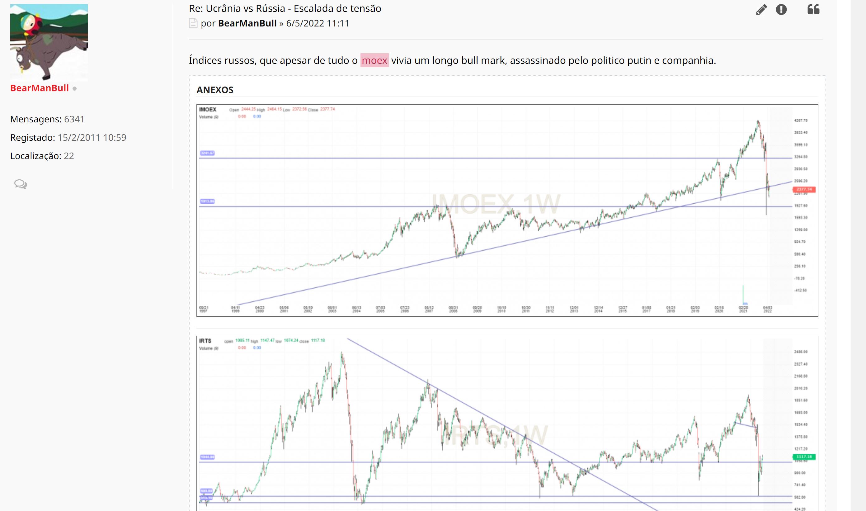 mais_um Escreveu:Já agora, desde ter sido decretado a mobilização parcial pelo Putin as bolsas russas têm estado a cair a pique, dos máximos do ano passado estão com quedas de 50% ou mais.