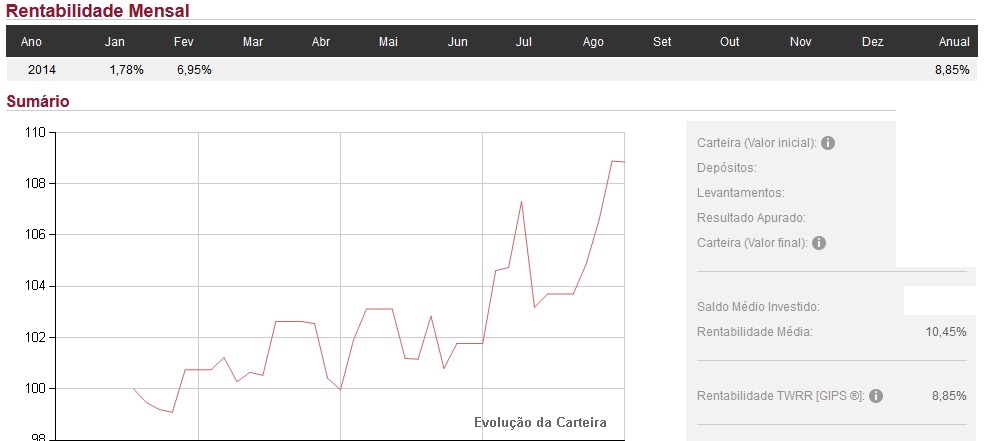Neste momento, além da carteira de obrigações que ocupa 97% da carteira tenho uma posição de 5% no ouro e uma posição de 3% no café, futuro de Maio 2014 e uma liquidez de 8%