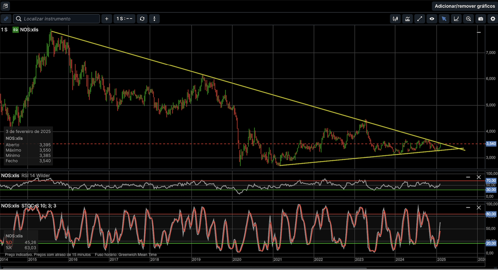 A chegar à estação / resistência dos 3,70. Não era mau respirar aqui um pouco, consolidando, lateralizando. O rompimento do triângulo apresentado pelo muad’ dib, dada a proximidade do apex, está a fazer o trabalho. (Para quem goste de fundamentais pode falar do flop da Digi até ao momento ou de a Nos ter descoberto outras formas de crescer via aquisições.)