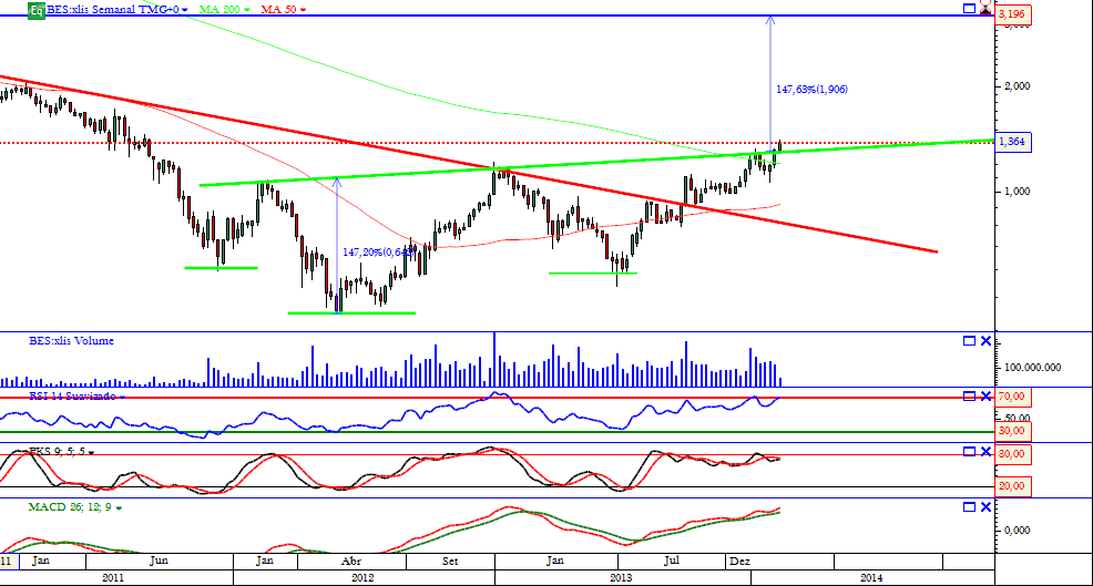 BES.LS oferece a melhor posição para tirar partido da recuperação económica em Portugal, segundo a Societé Generale (SocGen), que fez o 'rollover' do preço-alvo para 1,31 euros no final de 2014 vs 0,94 euros por acção antes.