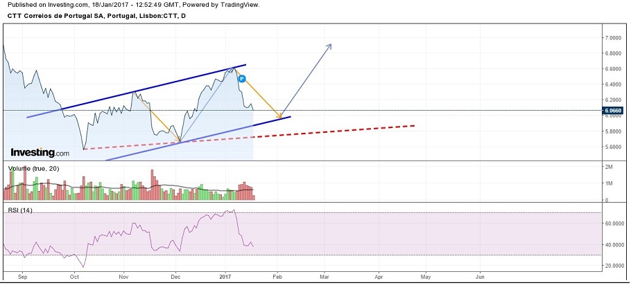 ora bem o errado aqui penso eu é de tentar pensar em investir a longo prazo; pois a nossa bolsa não está para isso; nem lá fora dà tanta segurança para pensar assim. Eu atualmente investo a curtissimo passo. Quando digo para investir todo numa ação , neste caso os Ctt , é quando tiver uma pequena valorização(3/5%) vender,não esquecer também que esta acção oscila bastante. Mais, se nada de ruim vier por aí não acredito que ela desça dos 6,00€. Daí eu pensar que o momento agora é ideal para entrar, e não tenho problema de dizer que já entrei mais á frente (6,13€)