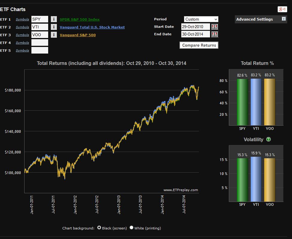 Aqui que ninguém nos houve, o VOO (S&P 500) e o VTI (US Total Market) tiveram, nos últimos 4 anos, o mesmo desempenho (