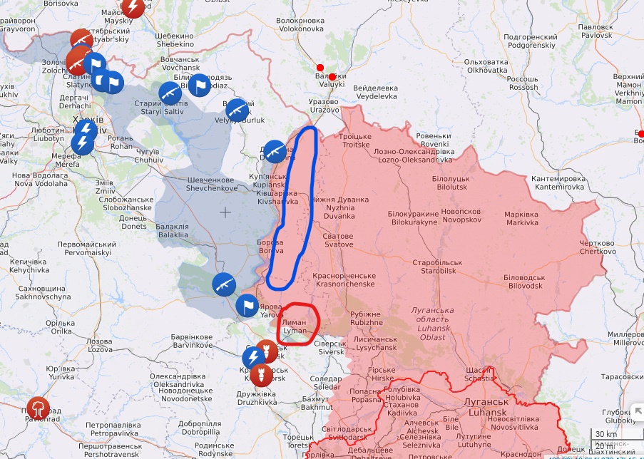 A grande incógnita é o que se passa em Lyman (circulo a vermelho), ontem havia imagens de forças ucranianas nos arredores, mas aparentemente os russos estão a tentar segurar a posição para permitir que parte das tropas que estão em fuga de Izyum possam chegar ao Oblast de Luhansk, penso que neste momento será o ponto mais quente da frente e a seguir com atenção.