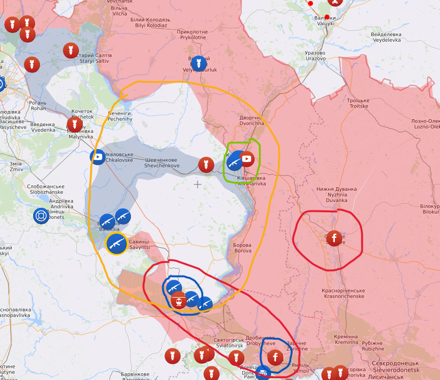 Com a libertação da Kupiansk (circulo a verde), há relatos que as tropas no eixo Iziuym/Lyman (o circulo grande a vermelho) estão em fuga, abandonado equipamentos, também há relatos dos próprios russos que as tropas russas também estão a abandonar Svatove (circulo pequeno a vermelho), já no oblast de Luhansk.