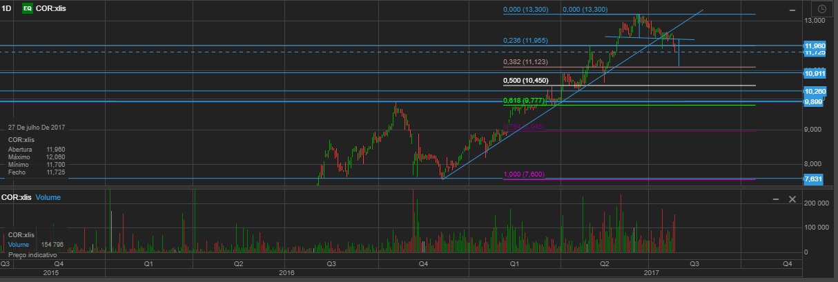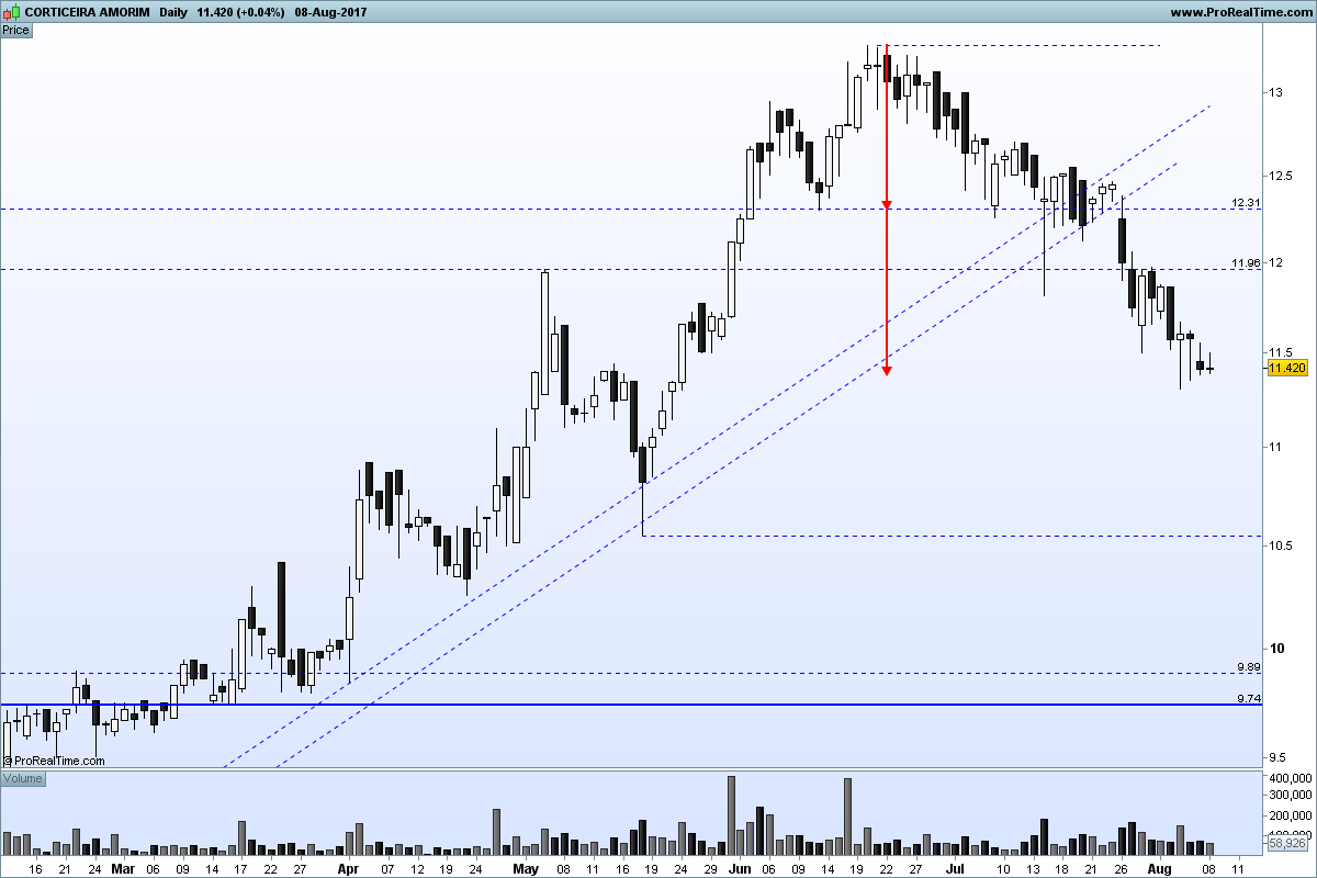 Bom, hoje tive que ser disciplinado e fechar a posição que tinha há mais de 8 meses na Corticeira com base na minha forma de estar neste mundo da bolsa, a AT. O gráfico diz-me que pelo menos uma retracção mais forte que o usual é provável, pelo menos até ali à zona dos 11€, onde não me importaria de reentrar caso desse sinais para isso. Ou até mais abaixo, quem sabe voltar aos 10€. Ontem, com bastante volume, quebrou a neckline de um H&S e hoje quebrou um suporte que considero importante igualmente com forte volume, fechando quase em mínimos da sessão. Ainda fiquei à espera que pudesse fazer um martelo na recta final mas não aconteceu, pelo que nestas coisas não se pode ter amor às acções, apesar de ser uma empresa de que gosto bastante pelo que conheço dela. Vou acompanhando para tentar um dia reentrar.