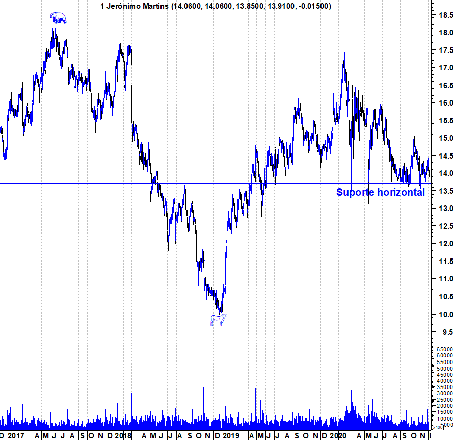 A Jerónimo Martins continua a aguentar o seu suporte na zona entre os 13,6 e os 13,7 euros.