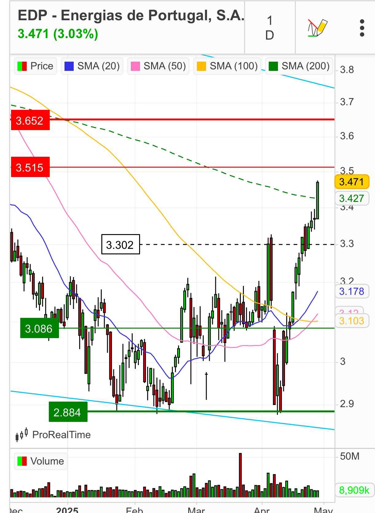 A cotação da Edp está imparável. Acima da média móvel 200 dias com cruzamento de médias móveis. Tudo a favor para que este movimento continue até aos 3,60€ antes do pagamento do dividendo.