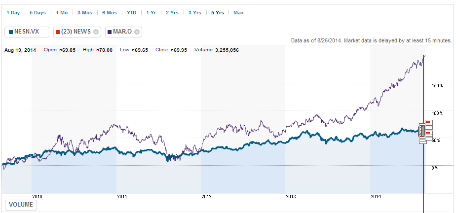 para concluir este tipo de empresas raramente pode dar os melhores retorno, toda a gente as conheçe a lupa , toda a gente sabe o que são e mesmo algumas que disse que tenho ai das europeias agrupam-se num sub grupo perto deste tipo Inbev H&m toda a gente as conhece( nao espero coisas estratosfericas delas honestamente nem da EL, nem era essa a ideia que era comprar coisas ainda com potencial mas com baixo risco), mas nao no nivel de nestles pg etc , por isso raramente compro este tipo de empresas, e no segundo do grupo que digo das conhecidas mas nao top top em mcap e que surgem os golos olha pa marriot vs nestle por exemplo desde 2009