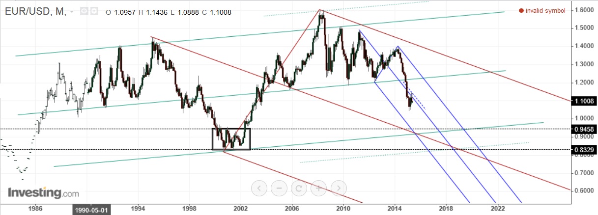 um gráfico mensal do eur/usd - estará o coil assinalado a atrair o preço?