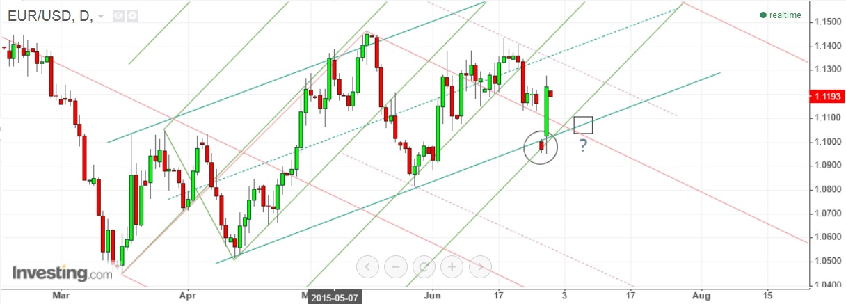 ou seja: previa-se este disparo do eur/usd pós gap-down sabendo-se do tal referendo grego e de toda a instabilidade em redor desta situação? o euro não ia descer? o dólar não iria tornar-se a moeda de refúgio? então, sobe ou desce, quanto, quando, e o quê? para baralhar, o preço fez melhor: 1º um gap down violento e dps uma subida abrupta... e assim, desta forma, o preço deu a volta à grécia.
