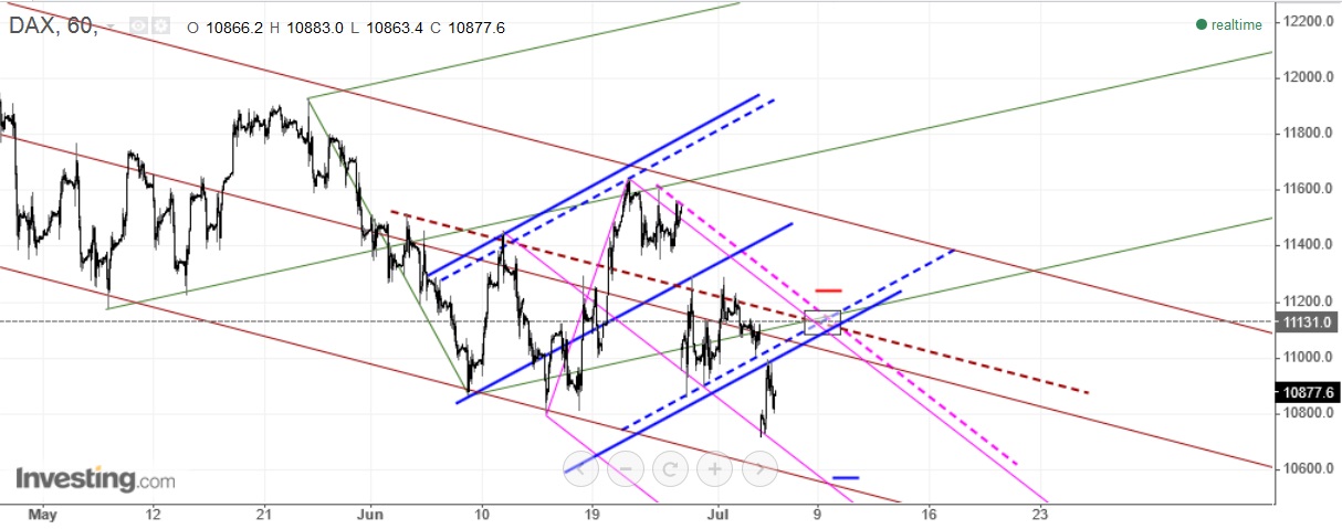 comecei a ver esta oportunidade curta no fórum do dax e é de tal modo a confluência de linhas que me pareceram relevantes, na zona assinalada, que resolvi colocá-la aqui no fórum das o.e. o stop é o único problema pois terá que ser um pouco largo (pelo menos acima das várias sliding parallels, necessariamente) mas com uma queda a pique, em vista.