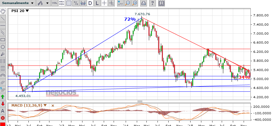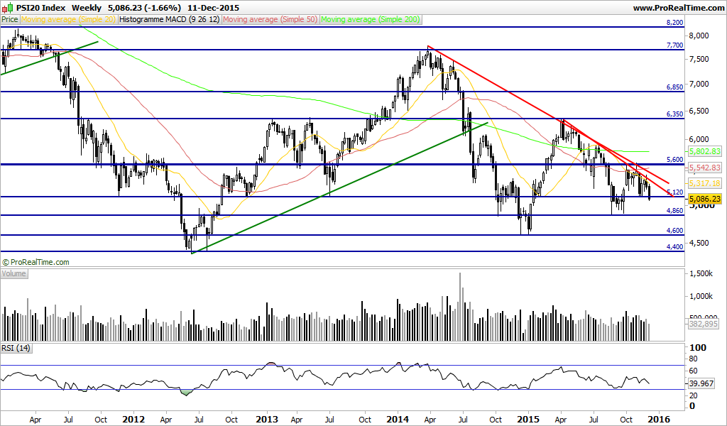 Cenário optimista: O PSI20 apoiou-se num padrão de inversão no gráfico horário para gerar um movimento ascendente de curto prazo no gráfico diário, estando agora prestes a retestar a zona do anterior máximo relativo. É, para já, esse o grande objectivo imediato. A quebra dos 5400 pontos em alta, seguida de uma retracção que se ficasse acima dos 5145 pontos, representaria uma alteração de tendência de médio prazo que poderia traduzir-se num rally um pouco mais prolongado em inícios de 2016.