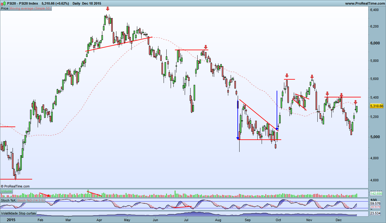 Também pode ser uma cunha que quando rebentar poderá dar festarola. Diria que mais provável para o lado dos ursos. O intervalo de negociação tem vindo a reduzir com o mercado a ficar mais concordante em termos das cotadas do psi. Mas penso ser uma situação temporária. Em 2016 e possívelmente logo no inicio é provável que surjam novas ideias quer dos touros quer dos ursos. Vou esperar para ver para que lado rompe. Se bem que com a fed pode vir um sinal que poderá induzir em erro nos primeiros dias.