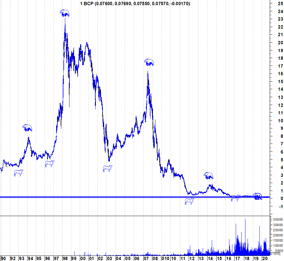 O BCP fez hoje um novo mínimo histórico. Ao longo dos últimos 20 anos, o BCP é um exemplo perfeito de como uma acção pode sempre cair mais do que se pode imaginar. Deixo os gráficos actualizados.