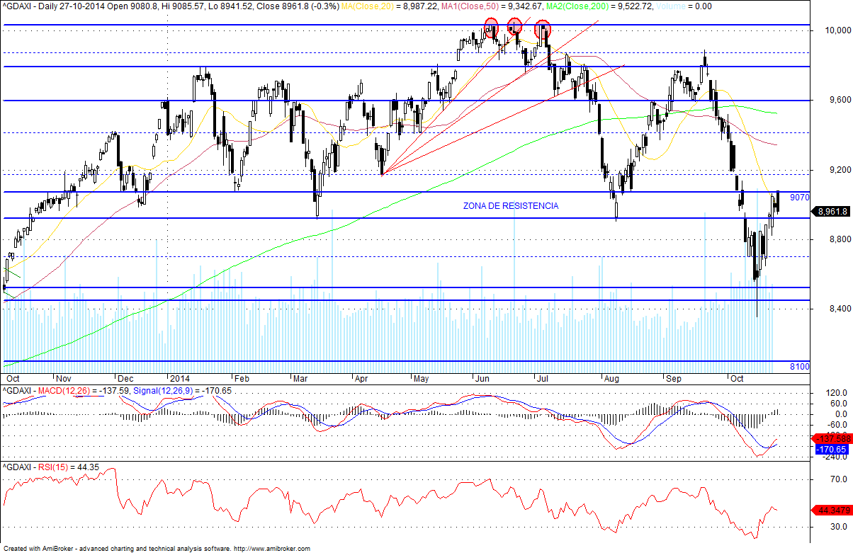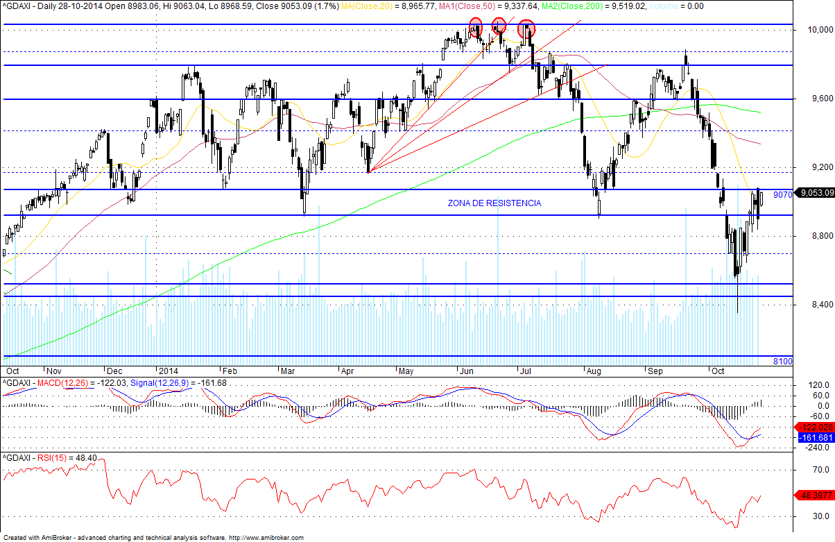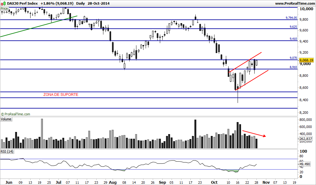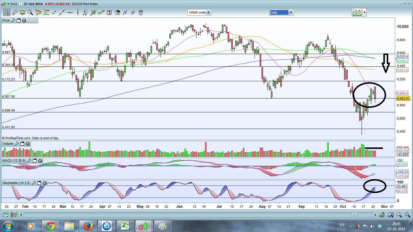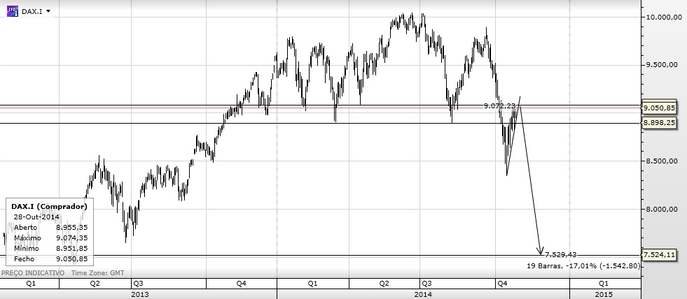 Podemos estar perante a formação de uma bandeira de baixa. Na minha opinião podemos. O target é assustador? É, mas não quer dizer que ele se venha a concretizar na totalidade. Se o dax não quebrar em alta a zona dos 9070 pontos e se fizer uma quebra em baixa da zona dos 8850 com um aumento de volume ela pode acontecer. É preciso ainda olhar para a questão temporal que já começa a ficar apertada