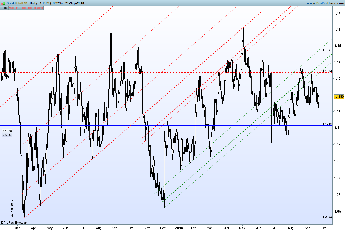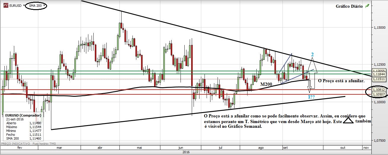 O que diz terá todo o sentido e certamente que pressiona a desvalorização do Euro. Mas por outro lado isso dificultaria uma subida dos juros americanos... e lá estaríamos de volta a este equilíbrio que se tem traduzido nesta longuíssima lateralização (mas que agora afunila na forma de um triângulo simétrico). Eu da minha parte continuo com a mesma análise que já aqui mostrei. É óbvio que estas descidas não são fáceis para quem está longo mas o que é um facto é que elas acabam por ser neutralizadas...