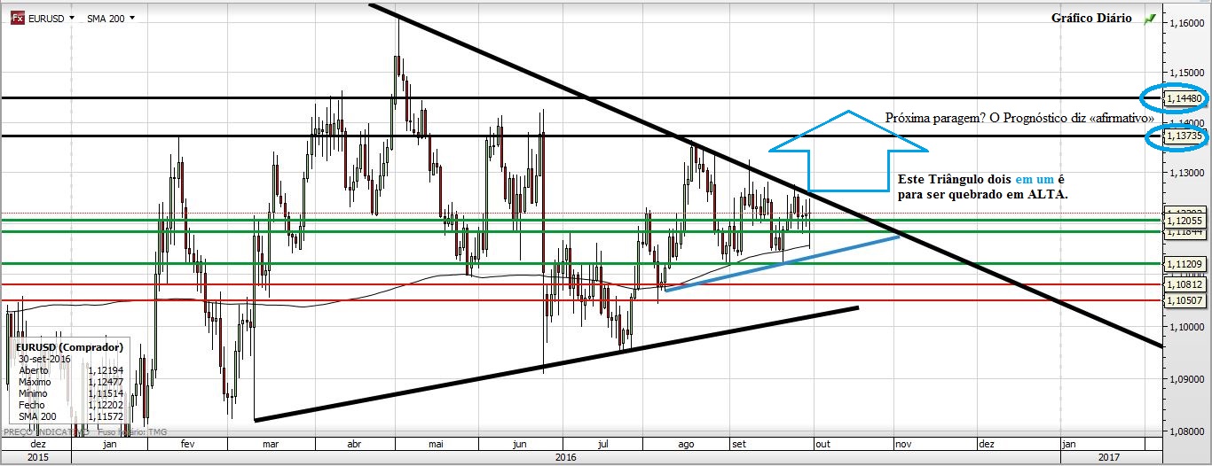 Eu tenho um projecto e que passa pela subida do EURUSD. Há que acreditar, não com a fé, mas sim com a análise. Eu acredito. Espero que hoje feche acima dos 1,12 e que o Triângulo quebre em alta brevemente. Hoje é porém um dia crucial, pois fica feita a vela mensal e a semanal será muito importante. Há que esperar com serenidade pelo final do dia.