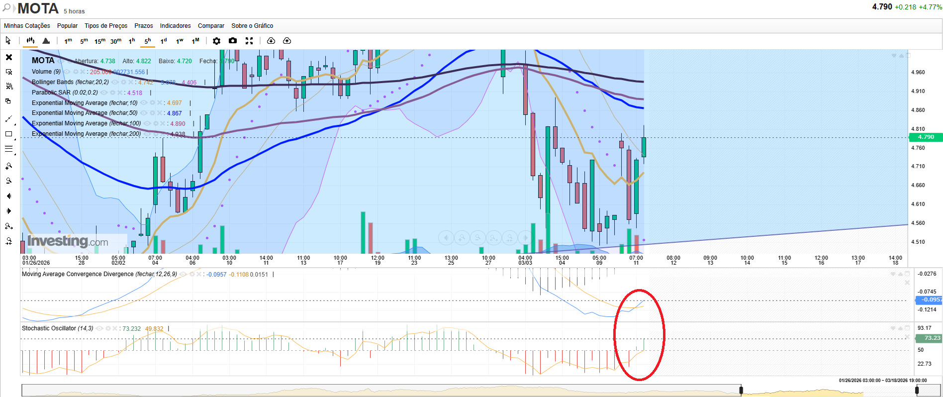 Analisando o gráfico 5H, temos sinais de força no MACD, noutros tempos/contexto a cotação da Mota estaria bem mais acima.