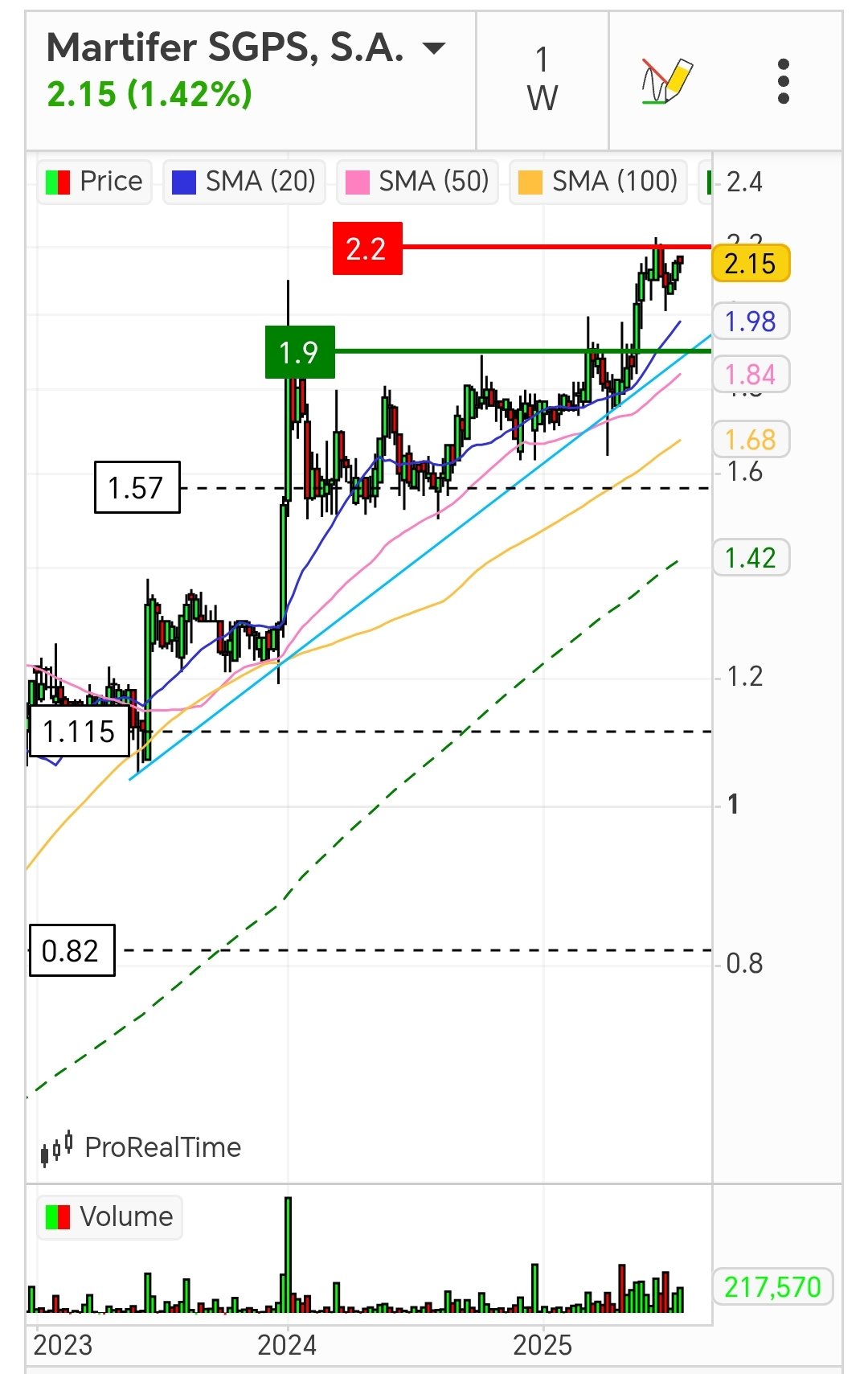 Hoje foi dia de máximos relativos de muitos anos na Martifer esta cotação já não era vista desde 2010, deixo um grafico de mais curto prazo mas onde é visivel que no ultimo arranque semelhante deu um salto de 1 euro na cotação , será que vamos ter alguma surpresa
