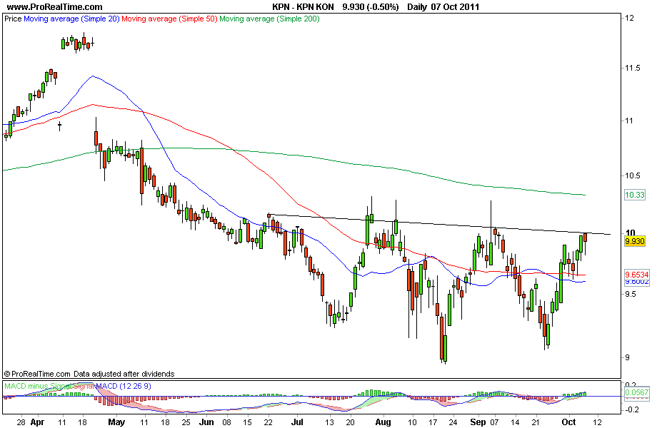 A KPN não é excepção: depois de ter quebrado vários suportes, anda agora em mínimos de 2008 e ainda por cima é empurrada para baixo por uma LTD que já vem de Abril do ano passado. Se quebrar os 8,5 não sei onde irá parar...