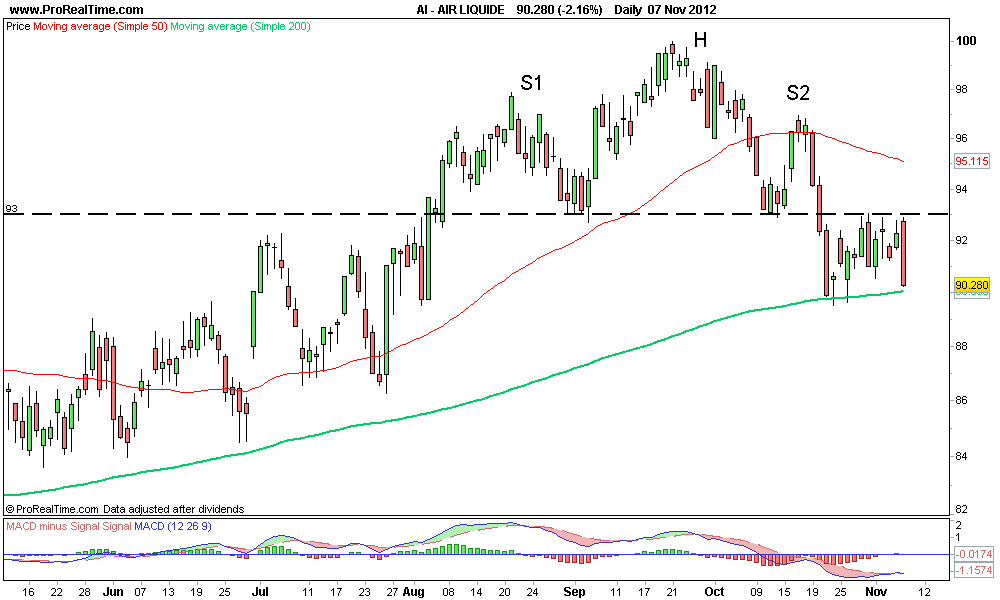 O fecho de ontem nos 92,35 activou uma cabeça-e-ombros na Air Liquide, com neckline nos 93 euros.