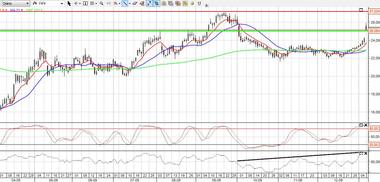 Reparem que na sessão de ontem se deu a quebra em alta da resistência dos 23 euros (esta resistência já tinha sido identificada anteriormente). Temos aqui um forte sinal de compra.