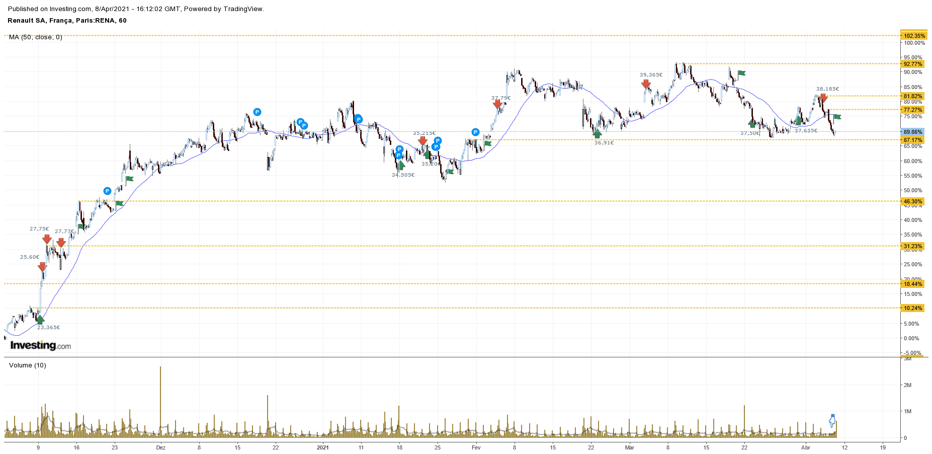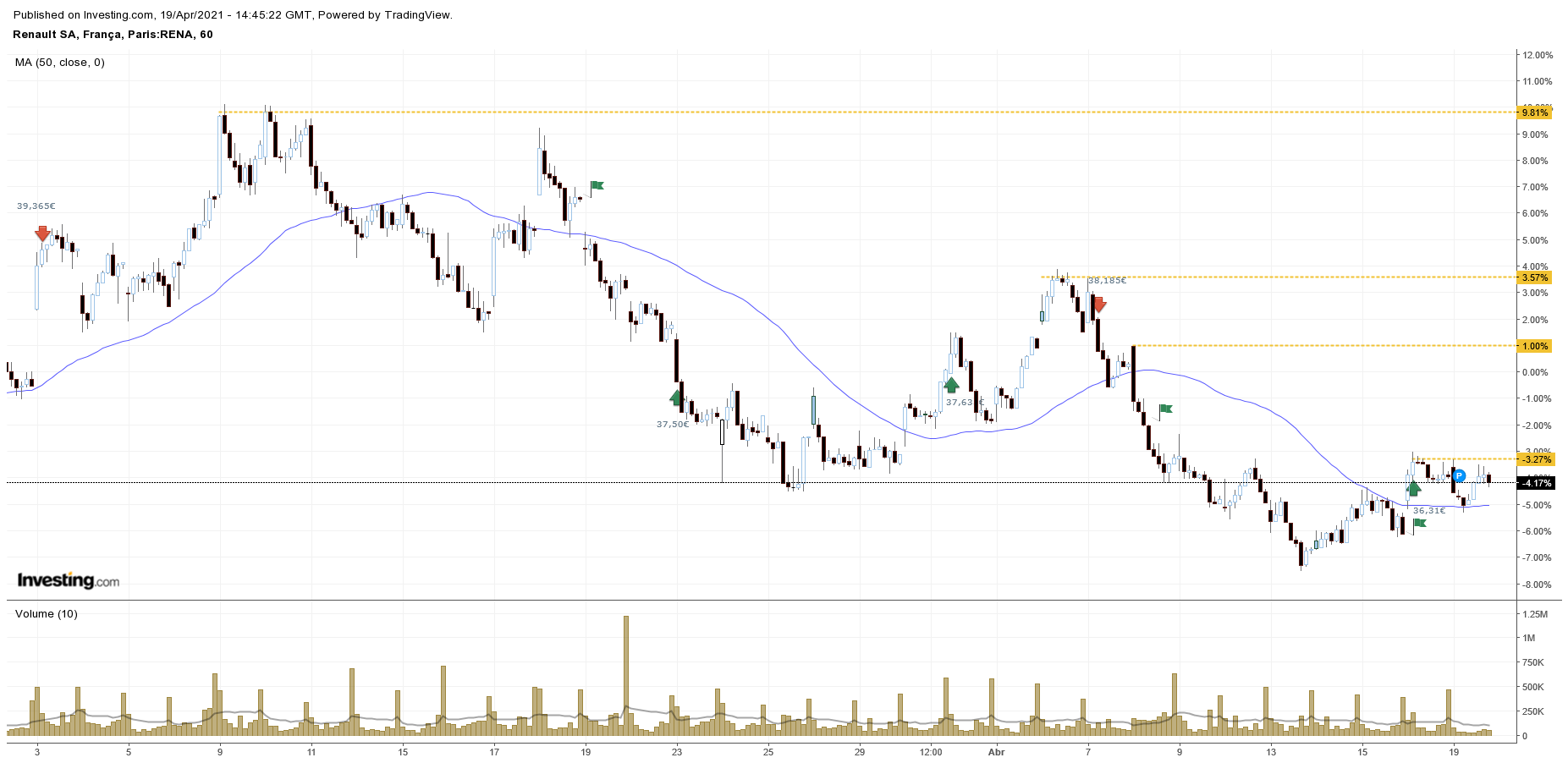 Neste momento e desde que começou a inverter a tendência, o intervalo é 41,31€/34,87€.