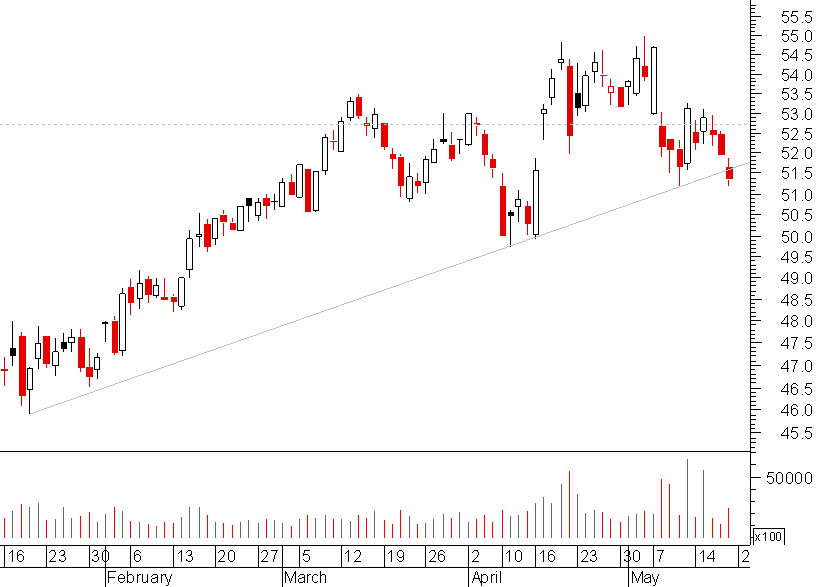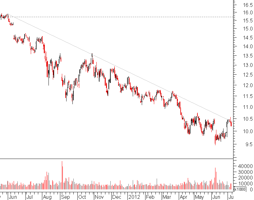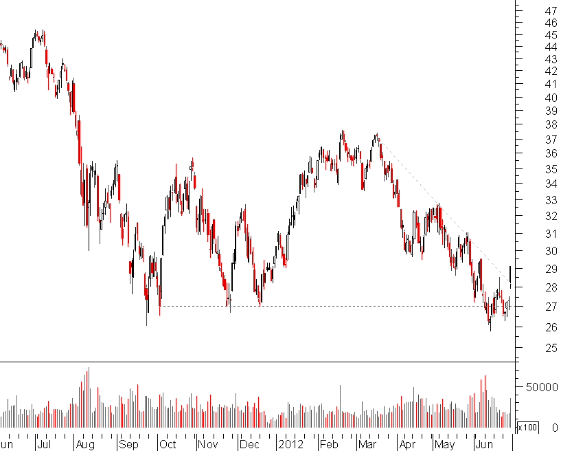 neste caso a st gobain está ainda longe de mínimos, mas como a tendência de médio longo prazo é descendente, o que disse acerca da SG aplica-se também aqui: está de facto sobre um suporte, mas a probabilidade do teste ter êxito é relativamente reduzida