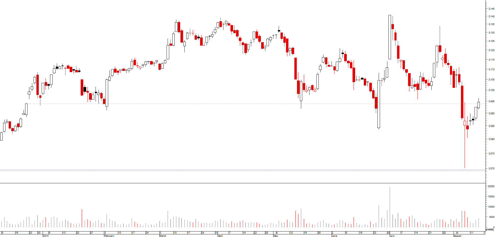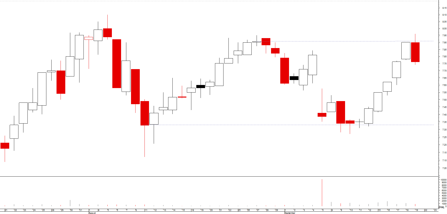 para aqueles que gostam de análises baseadas na análise de topos e fundos, depois do máximo de julho observa-se que a acção fez 1 lower low e, até agora, um lower high; deste ponto de vista, um sinal de força será um novo higher high, na forma de ser capaz de ultrapassar os 0,1222 euros.