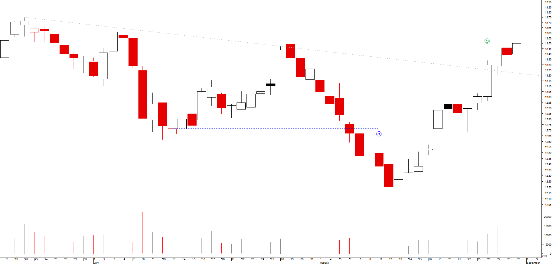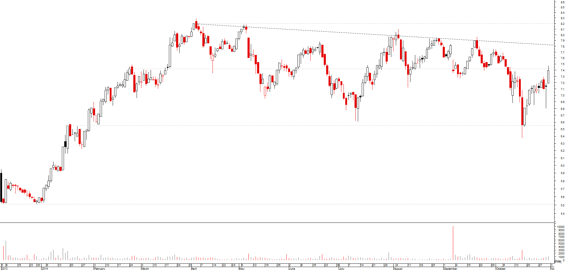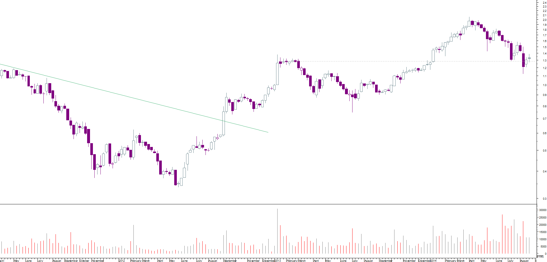sem dúvida que no curto médio prazo o banco se encontra sob uma tendência descendente clara, que leva a que inclusivamente teste um suporte crítico, situado na zona dos 1.31 euros, nascido do máximo de inícios de 2013; caso a quebra seja confirmada, então aceito o fim da tendência mas há que olhar para trás e ver o que a cotada fez numa situação em tudo semelhante, no ano passado: pelo máximo anterior (na zona dos 0.897 euros) nasceu uma zona de resistência, que veio ulteriormente a funcionar como suporte, e que chegou a ser significativamente penetrada, tendo contudo a acção sido capaz de recuperar, ultrapassar a resistência e ir para novos voos